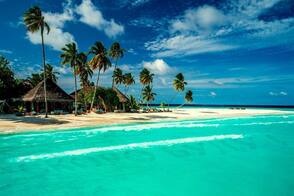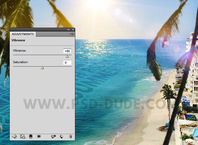 Если вы хотите сделать изображение более привлекательным, то вы можете добавить пальмы, которые создадут отличную основу. С помощью любого инструмента выделения, с которым вы предпочитаете работать, отделите пальмы от заднего фона. Для коррекции цветовых тонов, используйте коррекцию Цветовой Баланс (Color Balance) и Цветовой тон / Насыщенность (Hue/Saturation) для ослабления яркости.