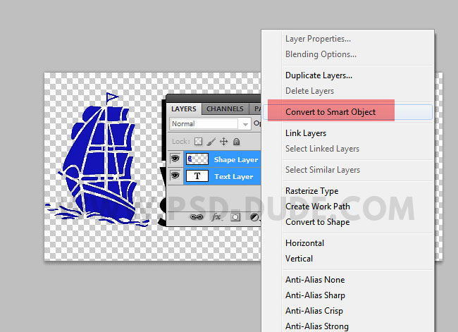 Выделите слой с текстом и слой с силуэтом парусника, чтобы преобразовать их в смарт-объект. Как только вы выделили указанные слои, далее, щёлкните правой кнопкой мыши по выделенным слоям и в появившемся окне выберите опцию Преобразовать в Смарт-объект (Convert to Smart Object). Назовите этот слой Текст на воде (Water Text).
