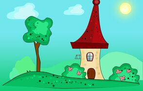 Прекрасный мультяшный домик со светом в окошке башни. Молодец!